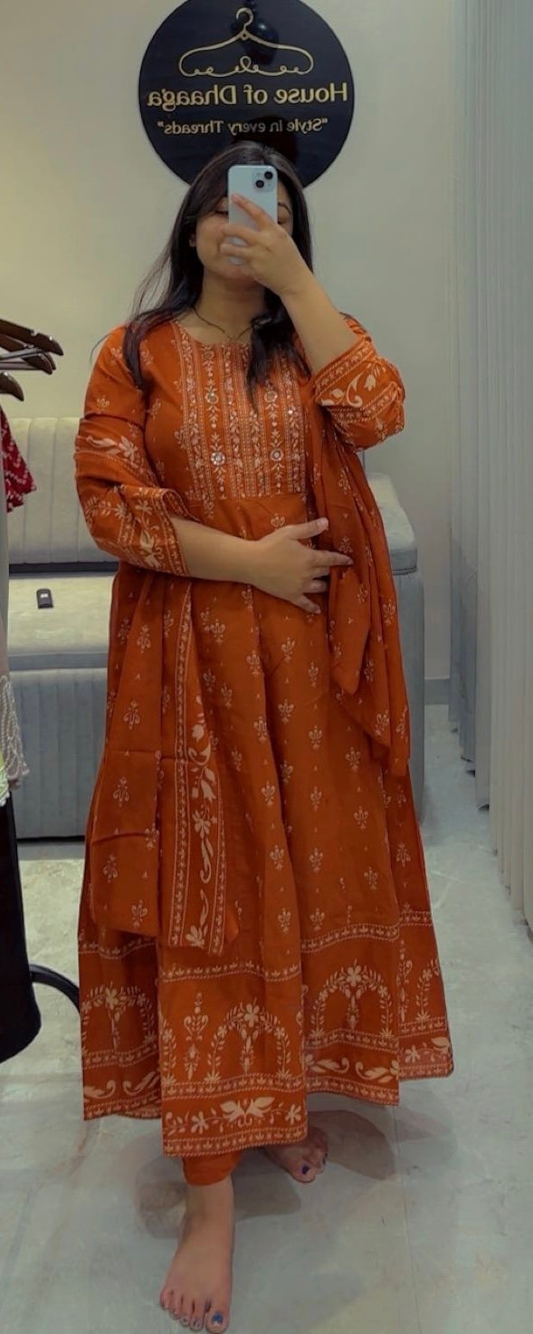 Upgrade your wardrobe with this stylish 3 Piece Dress with Dupatta crafted from high-quality mull cotton fabric, offering a perfect blend of comfort and traditional elegance. The soft and breathable material ensures a smooth and relaxed feel throughout the day, making it ideal for warm weather. The 3/4 sleeve design adds a graceful touch, while the rich rust color enhances the overall look with a warm and classy appeal. Perfect for festive occasions, casual gatherings, or everyday ethnic styling, this outfit pairs beautifully with minimal accessories and traditional footwear for a complete look.