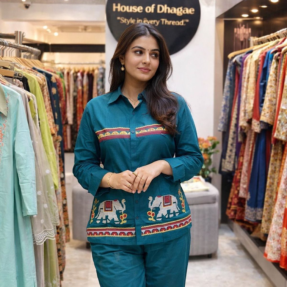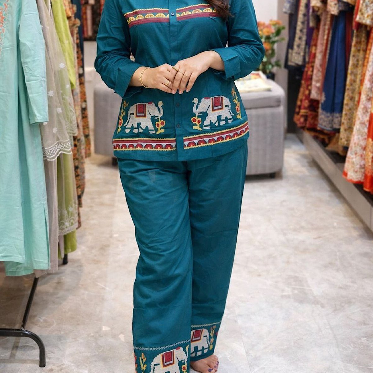 Upgrade your wardrobe with this fashionable Co-Ord Set crafted from high-quality mull cotton fabric, offering a perfect blend of comfort and modern style. The soft and breathable material ensures a smooth and relaxed feel throughout the day, making it ideal for all-day wear. The 3/4 sleeve design adds a stylish and balanced look, while the elegant teal color gives a fresh and trendy appeal. Perfect for casual outings or everyday wear, this versatile co-ord set pairs effortlessly with minimal accessories and comfortable footwear for a complete and chic outfit.