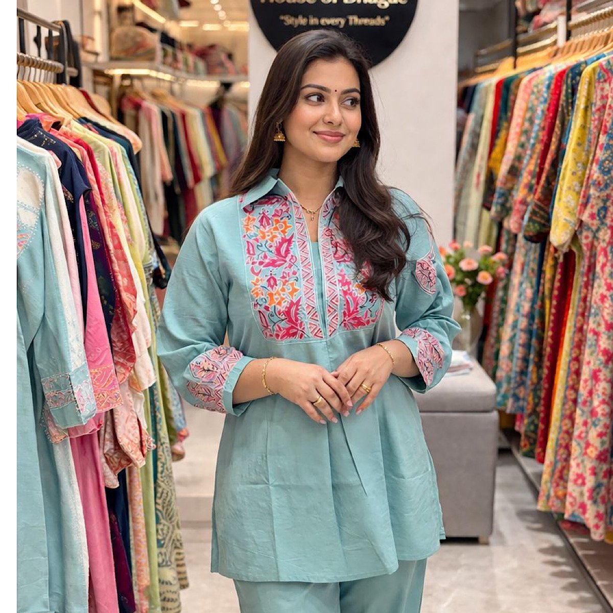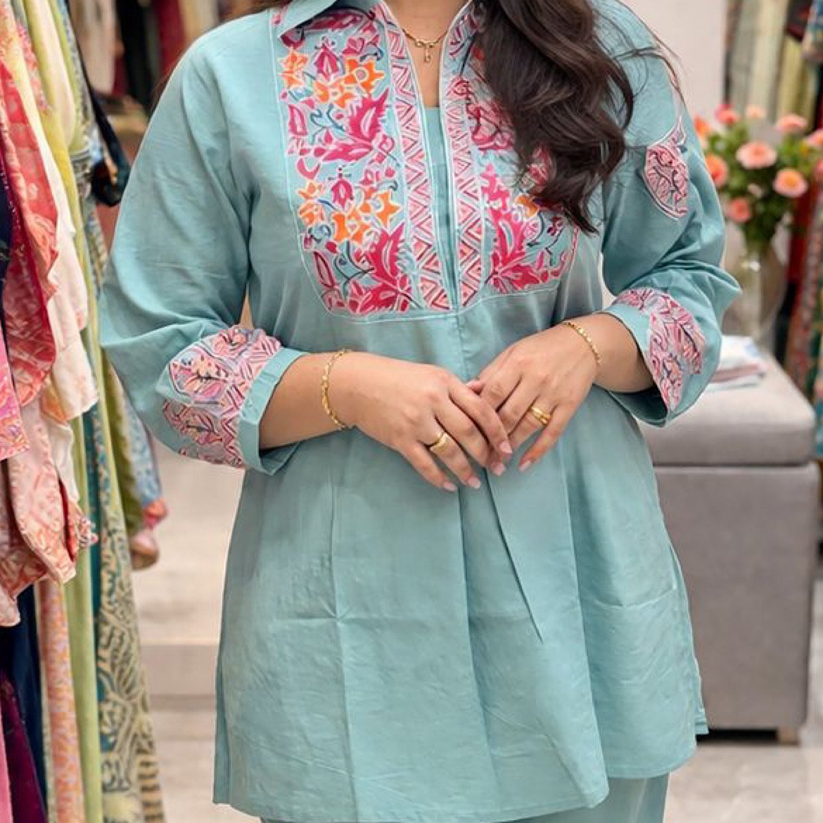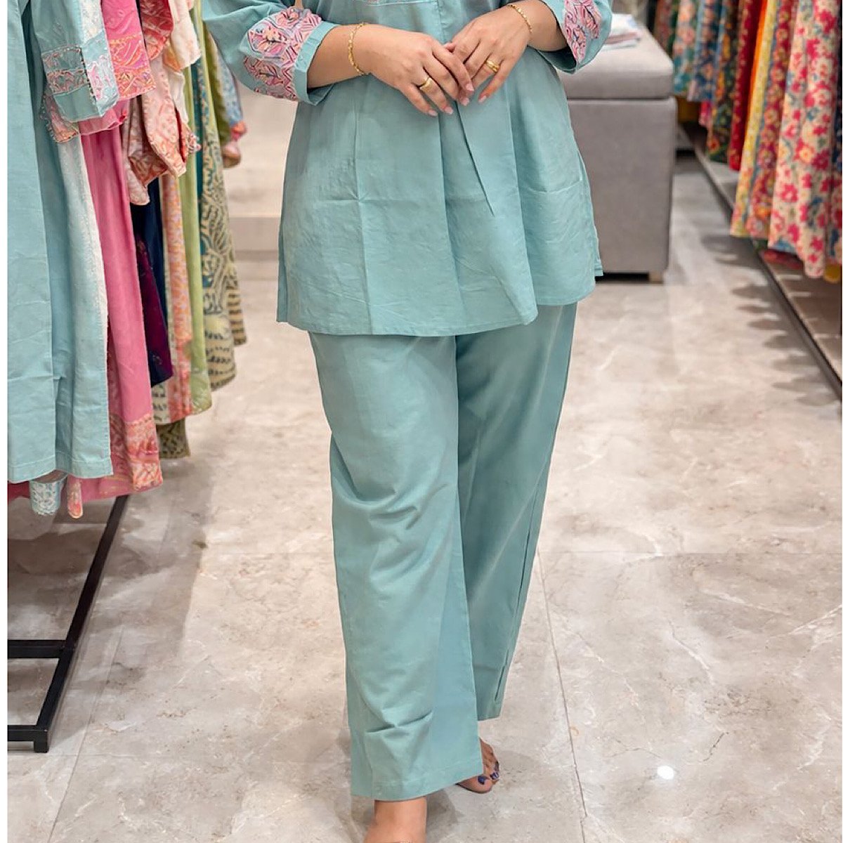 Upgrade your wardrobe with this fashionable Co-Ord Set crafted from high-quality mull cotton fabric, enhanced with delicate thread work for a stylish and refined look. The soft and breathable material ensures a smooth and comfortable feel throughout the day, making it ideal for all-day wear. The 3/4 sleeve design adds a balanced and elegant touch, while the vibrant firozi color gives a fresh and eye-catching appeal. Perfect for casual outings or everyday wear, this versatile co-ord set pairs effortlessly with minimal accessories and comfortable footwear for a chic and modern outfit.