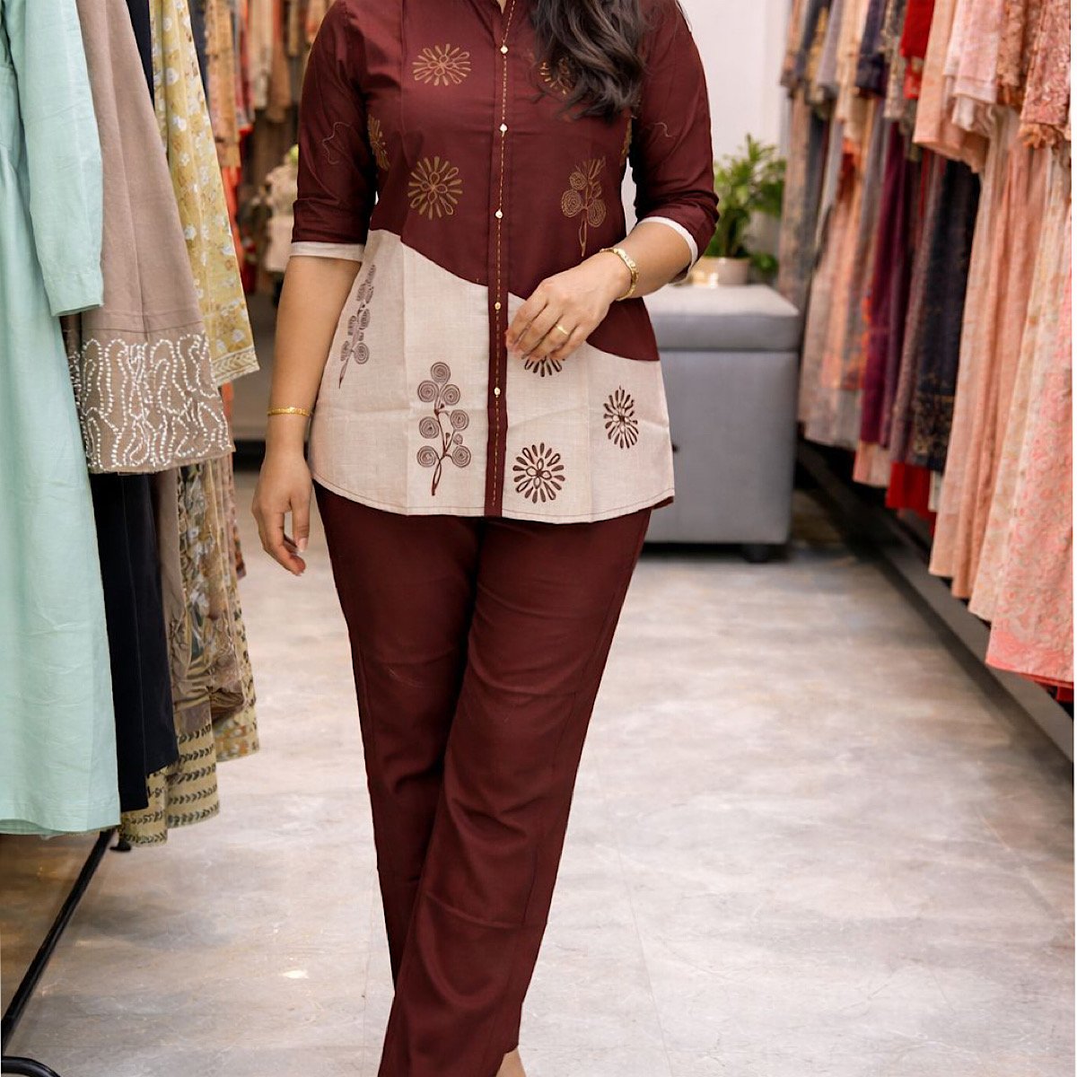 Upgrade your wardrobe with this fashionable Co-Ord Set crafted from high-quality Russian silk, offering a perfect blend of comfort and elegance. The soft and smooth fabric gives a rich and graceful look while ensuring a comfortable feel throughout the day. The 3/4 sleeve design adds a balanced and stylish touch, and the brown with cream color combination enhances the overall outfit with a classy and sophisticated appeal. Perfect for festive occasions, casual gatherings, or special events, this co-ord set pairs beautifully with minimal accessories for a complete and polished look.