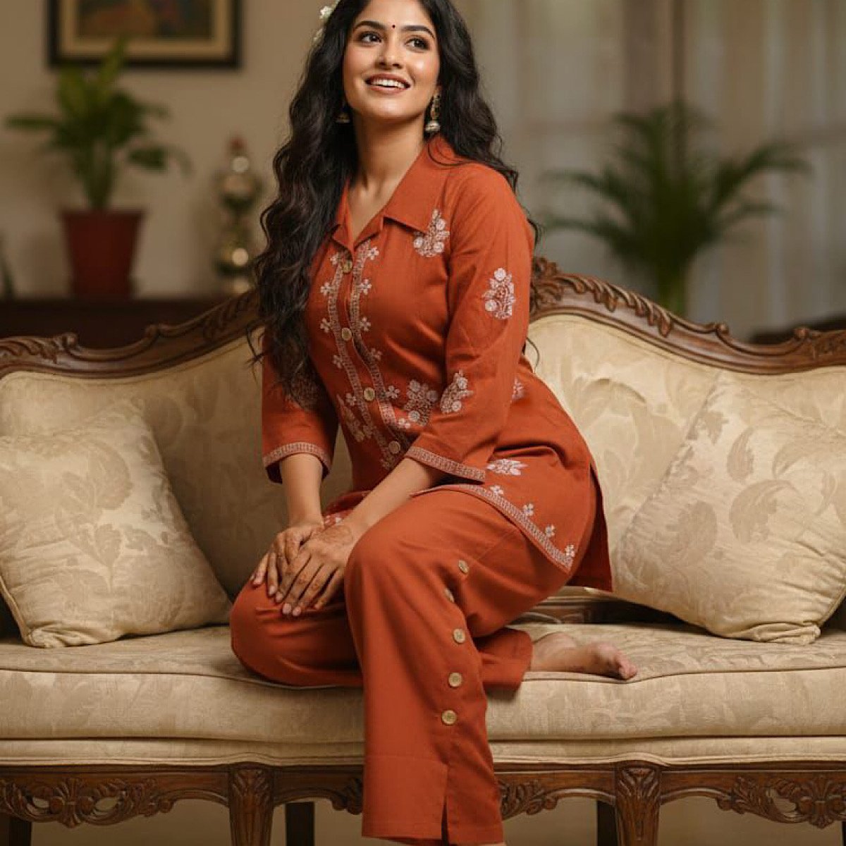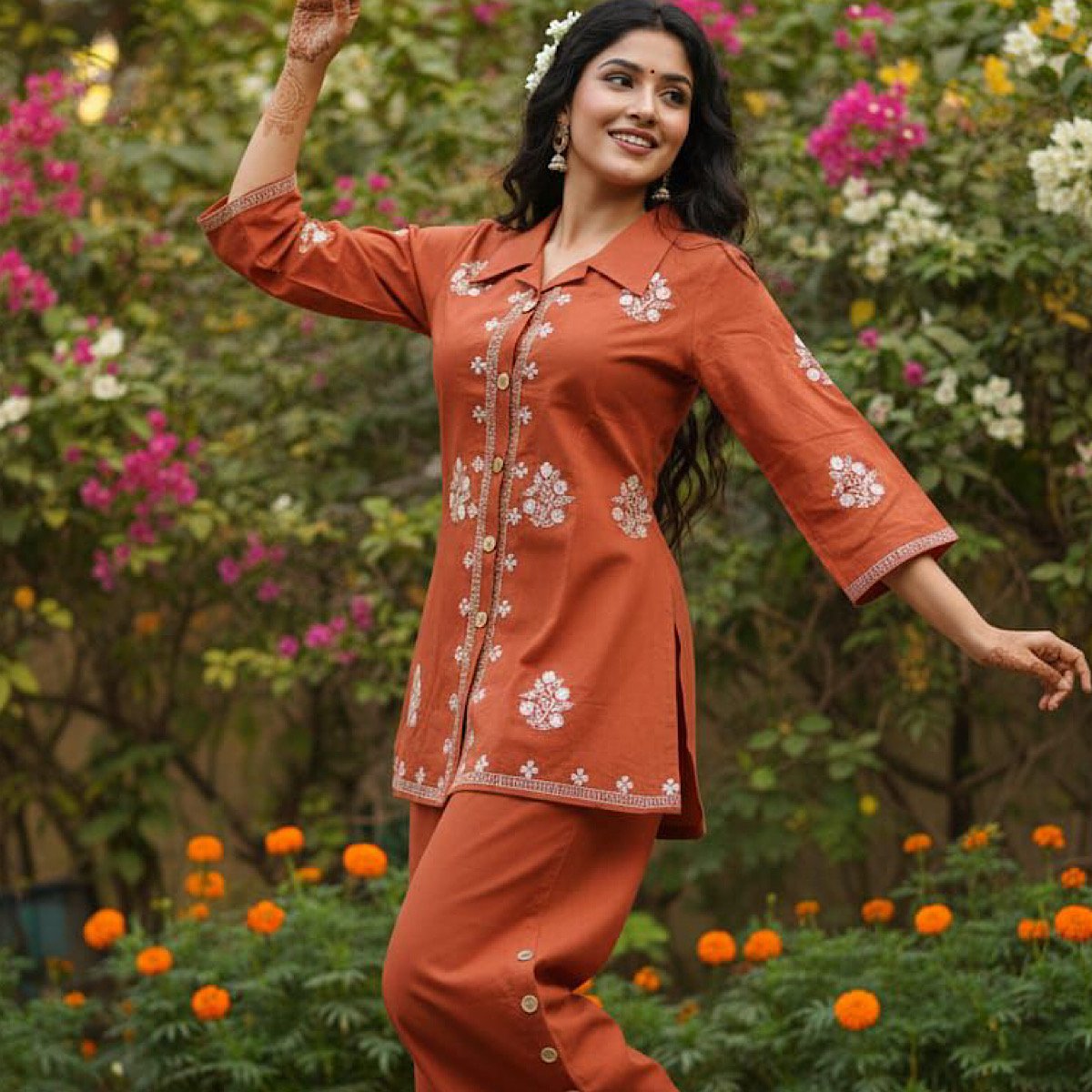 Upgrade your wardrobe with this fashionable Co-Ord Set crafted from high-quality pure cotton fabric, designed to combine comfort with elegant style. The soft and breathable material ensures a pleasant feel throughout the day, making it ideal for regular wear. The embroidery thread work on the sleeves adds a stylish and unique touch to the outfit. Designed with a comfortable fit and a classy single-color look, this co-ord set is perfect for casual outings, daily wear, or relaxed gatherings. Pair it with minimal accessories and comfortable footwear for a complete and trendy look.
